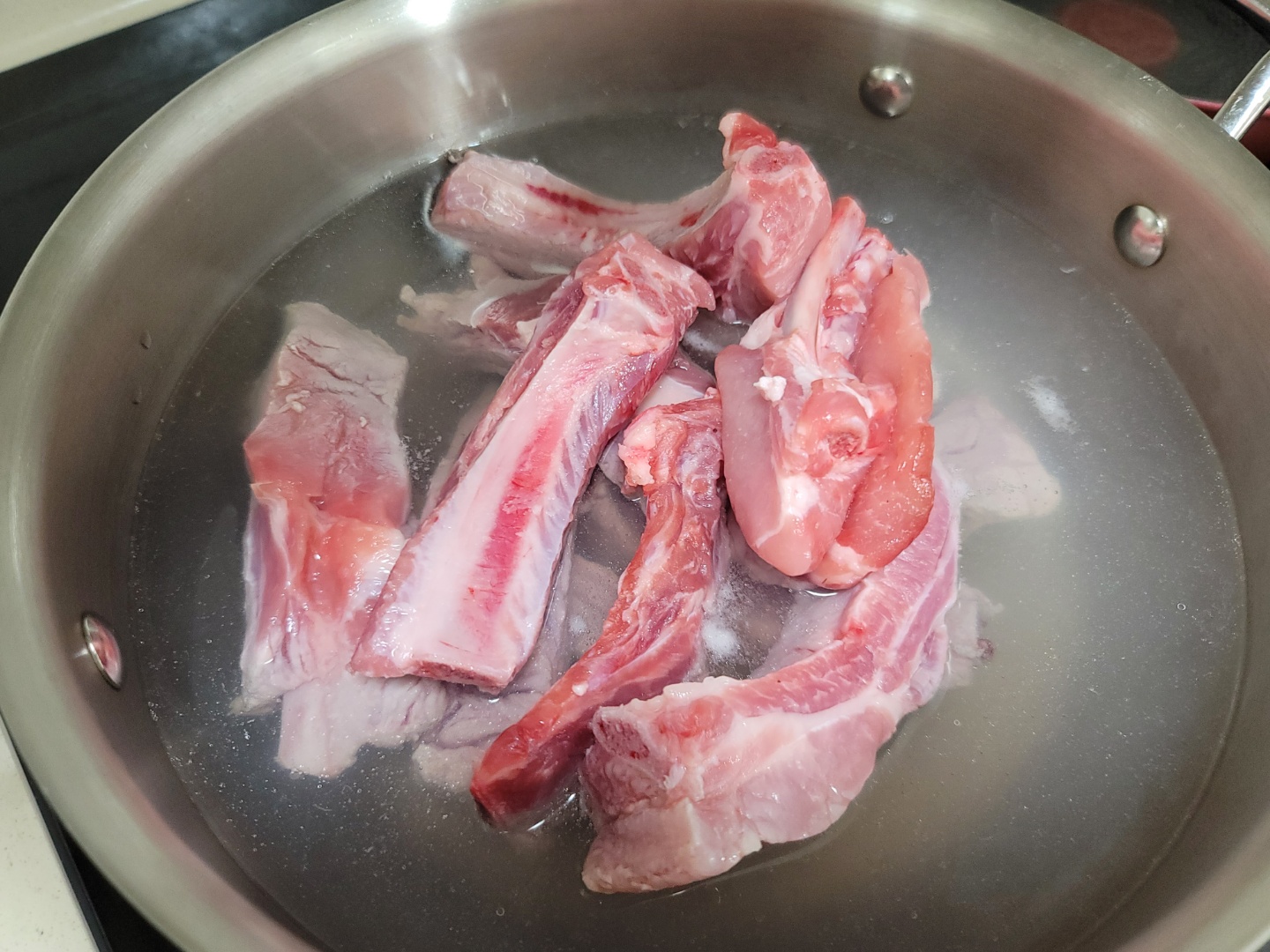 1. 끓는 물에 소주를 넣고, 등갈비를 넣은 뒤 5분 팔팔 삶습니다.