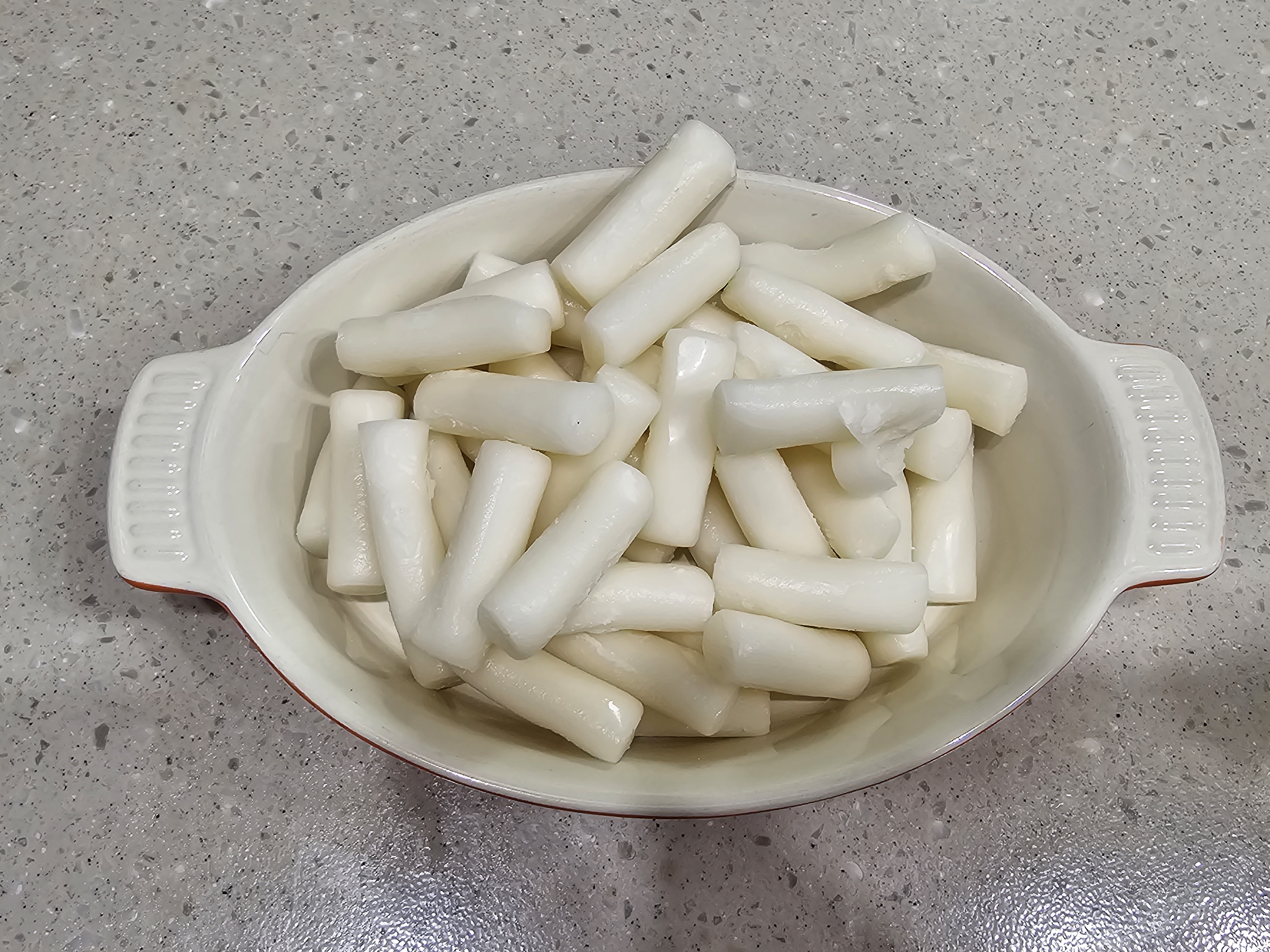 마트에 판매하는 300~400g짜리 떡볶이 떡을 준비해줍니다. 조리할 때 편하게 하기 위해 떡끼리 서로 떼줍니다.