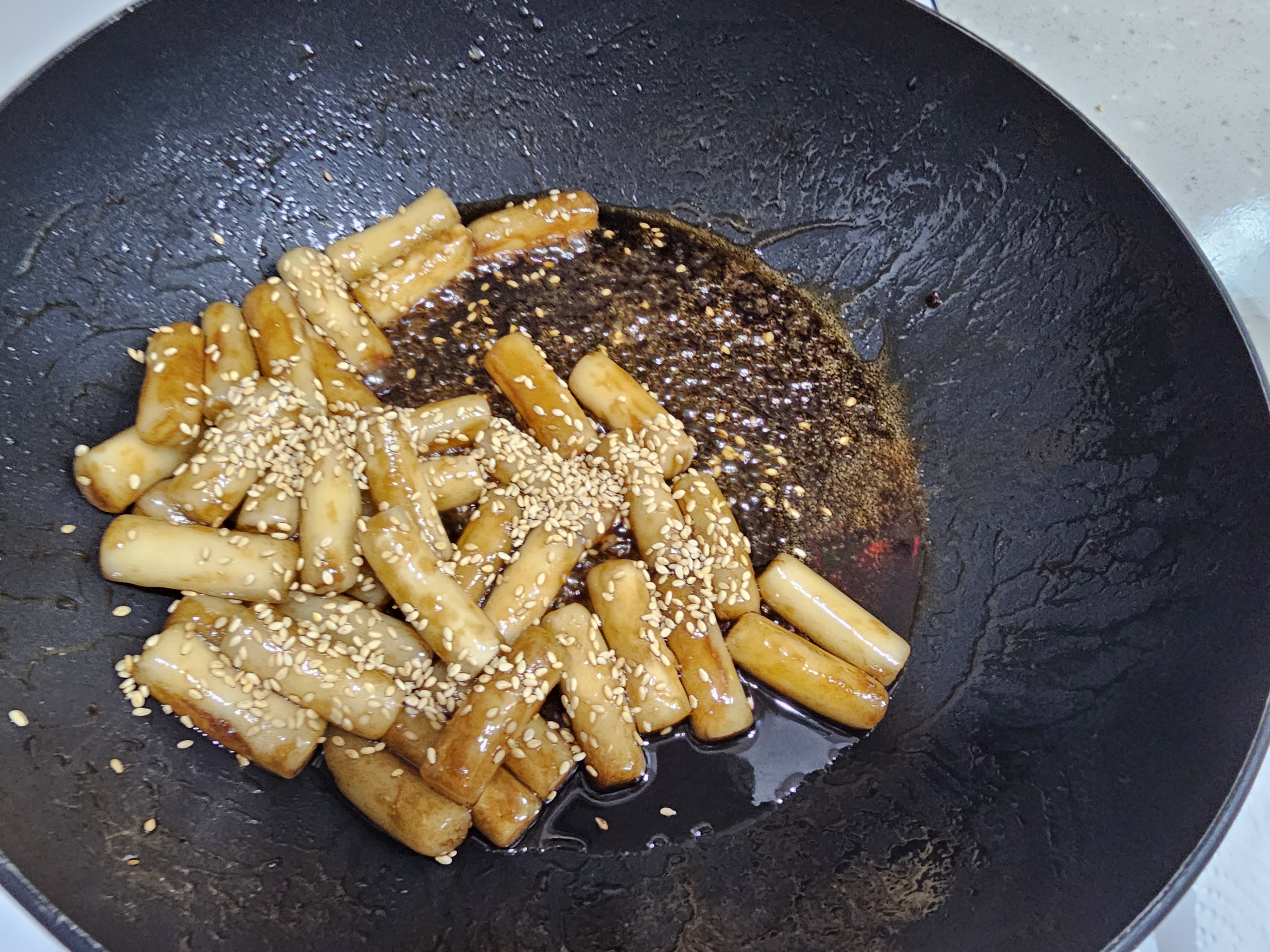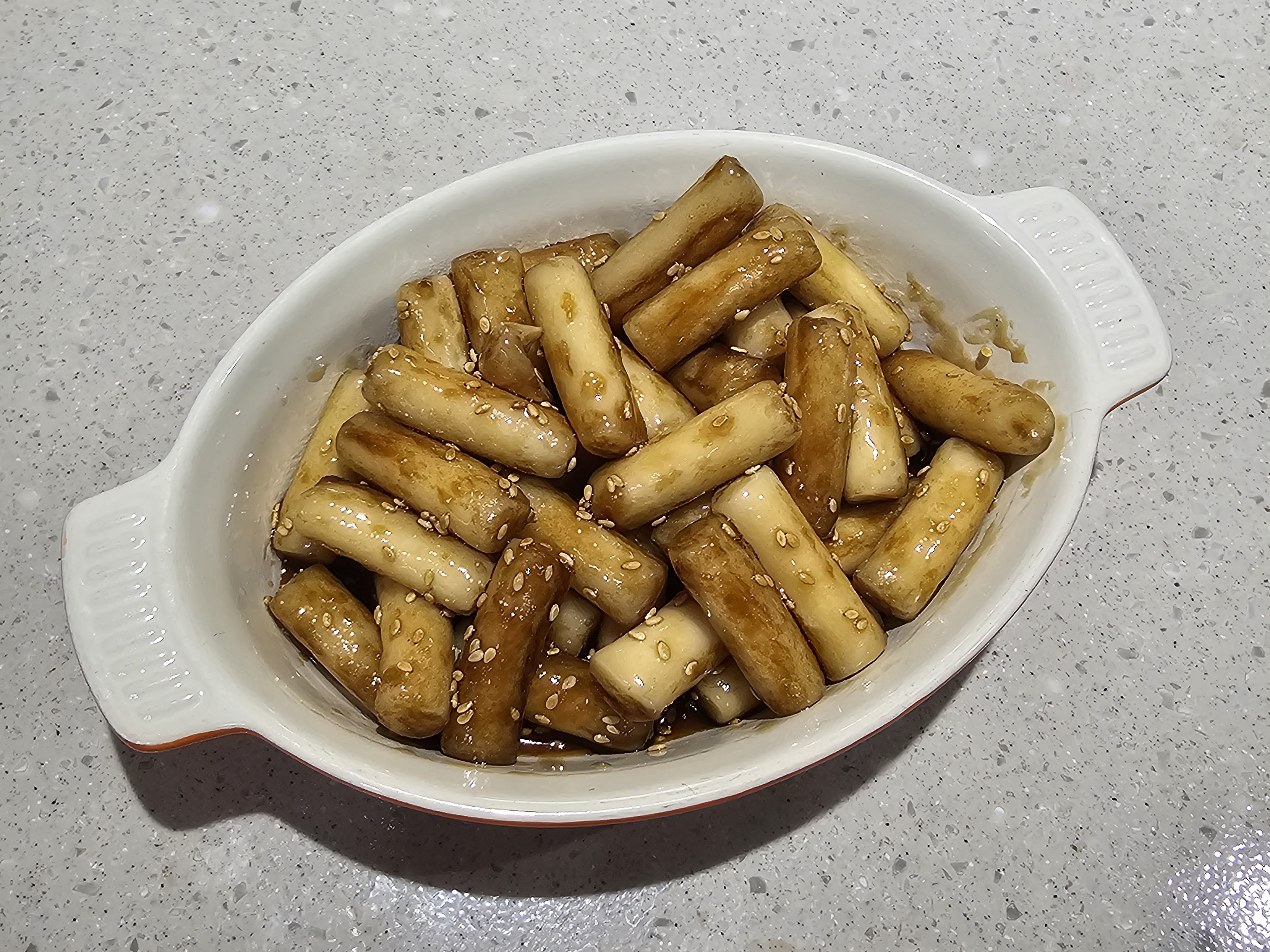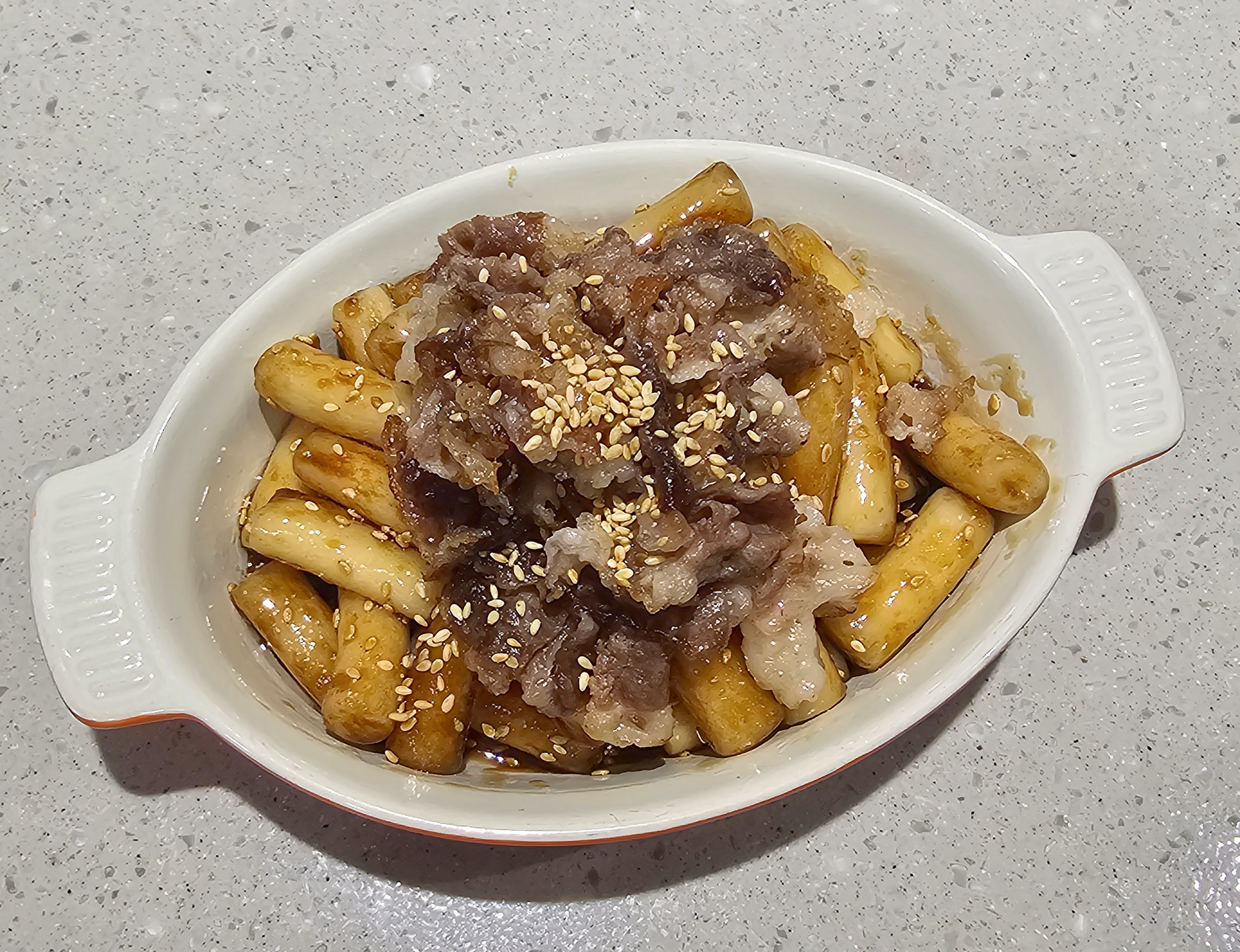 떡볶이 1봉지, 간장 1.5T, 설탕 2T, 참기름 1T, 통깨 조금, 차돌박이(선택)