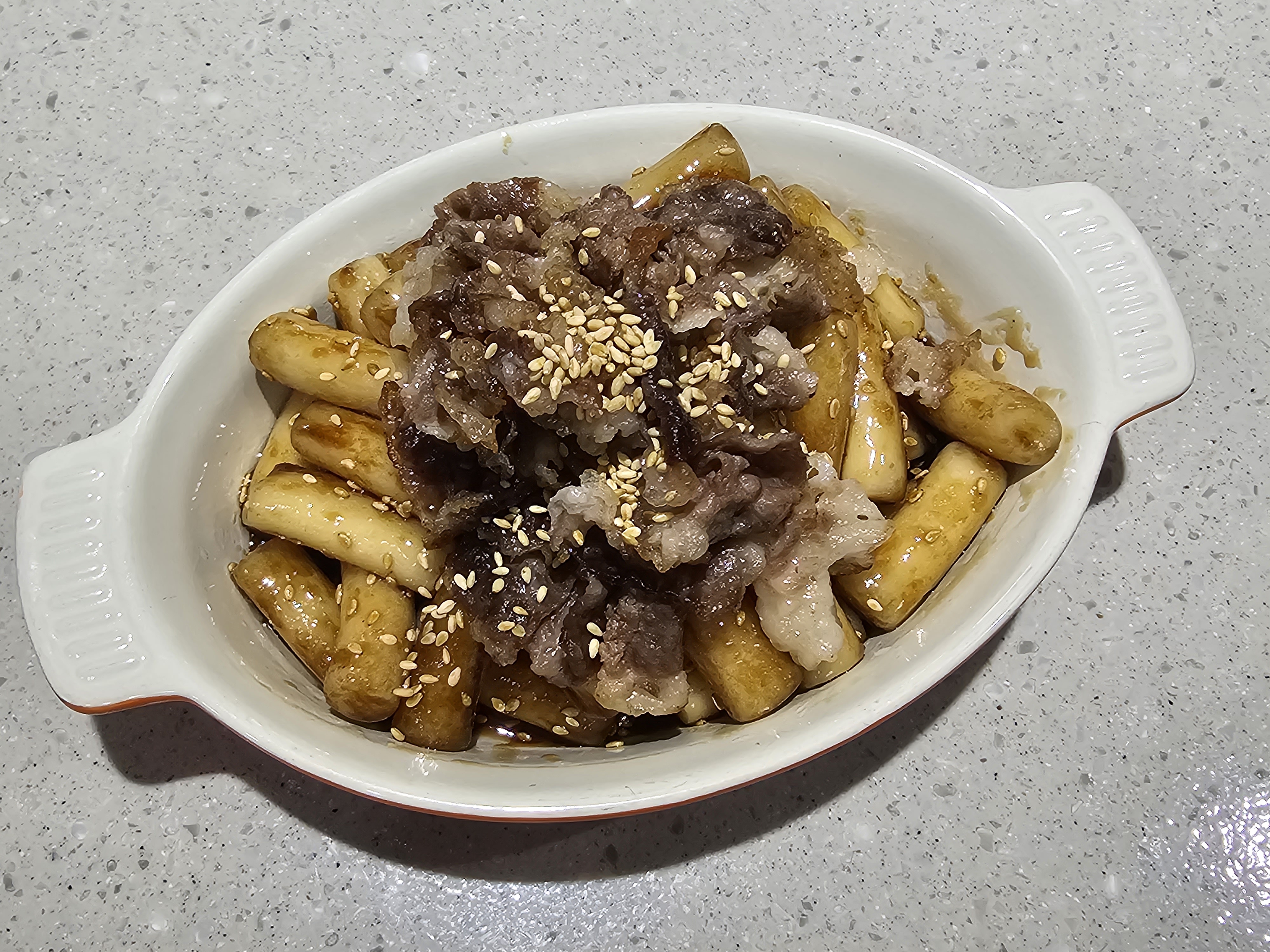 떡볶이 1봉지, 간장 1.5T, 설탕 2T, 참기름 1T, 통깨 조금, 차돌박이(선택)