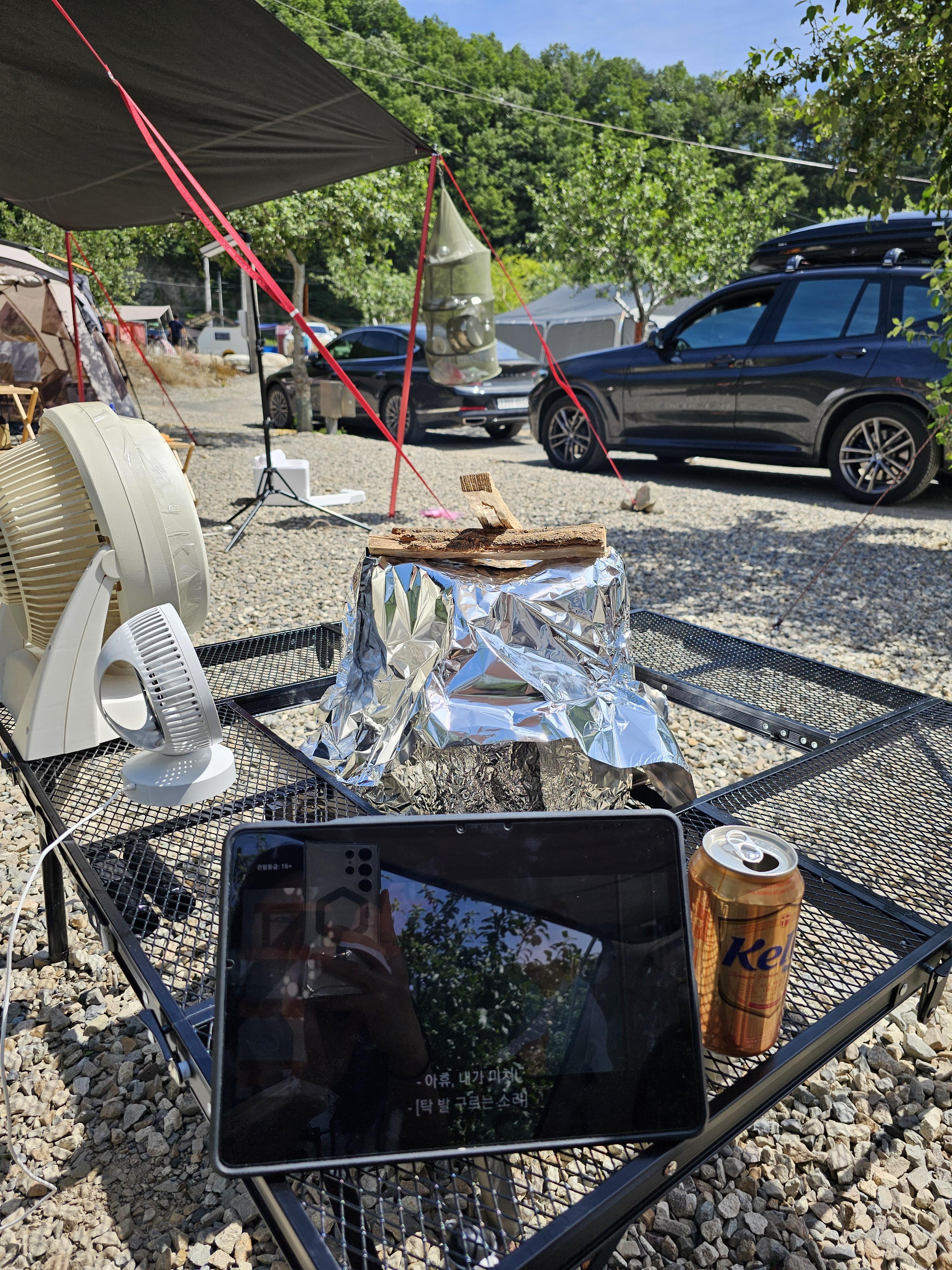 시중 500ml 맥주 아무거나 반틈 정도 마셔줍니다. 아침에 마시는 맥주는 캠핑장에서만 느낄 수 있는 재미입니다. 원래는 맥주 캔 그대로 꽂아서 조리를 하는데, 저는 비어캔 홀더를 이용했습니다.