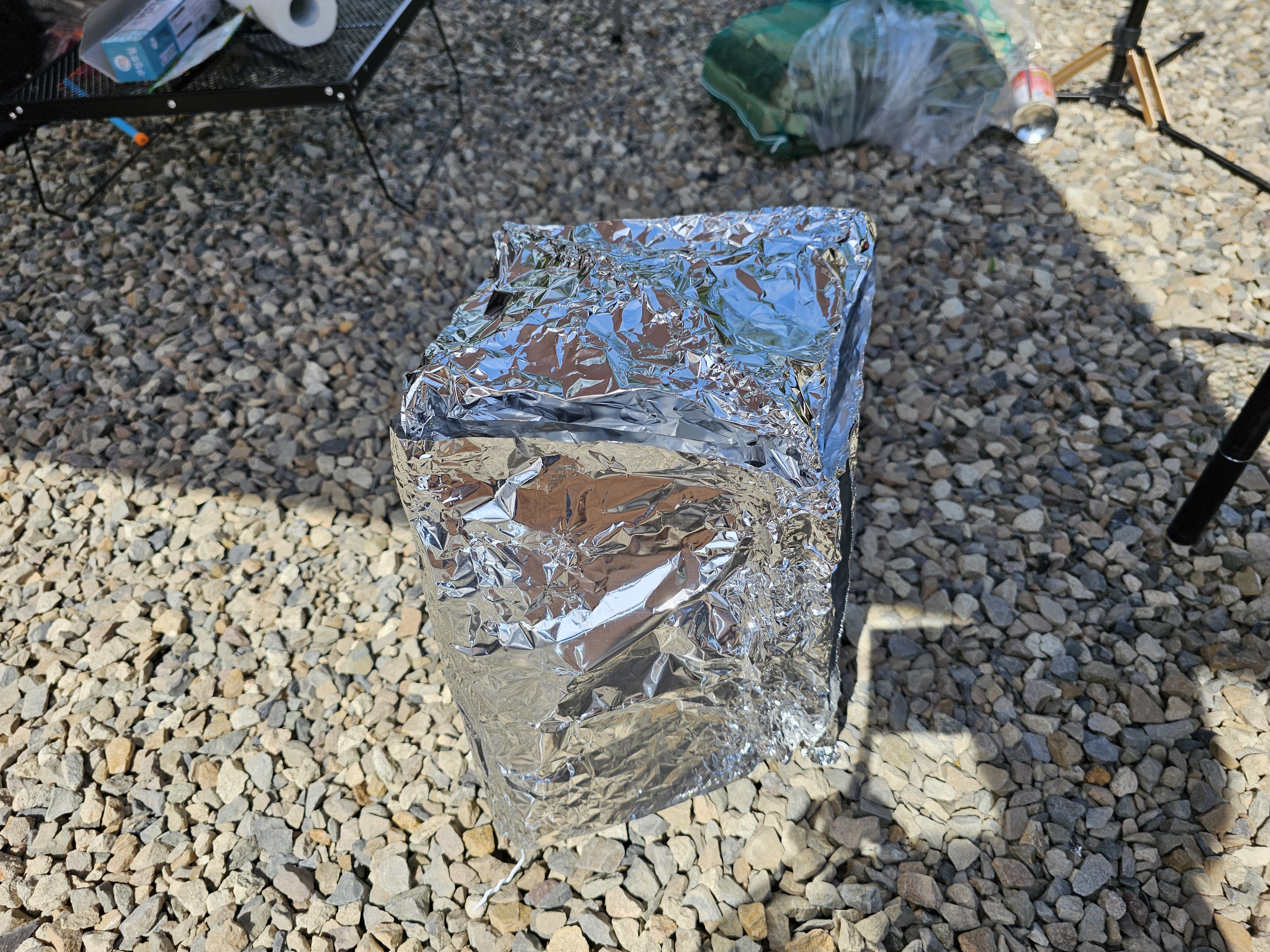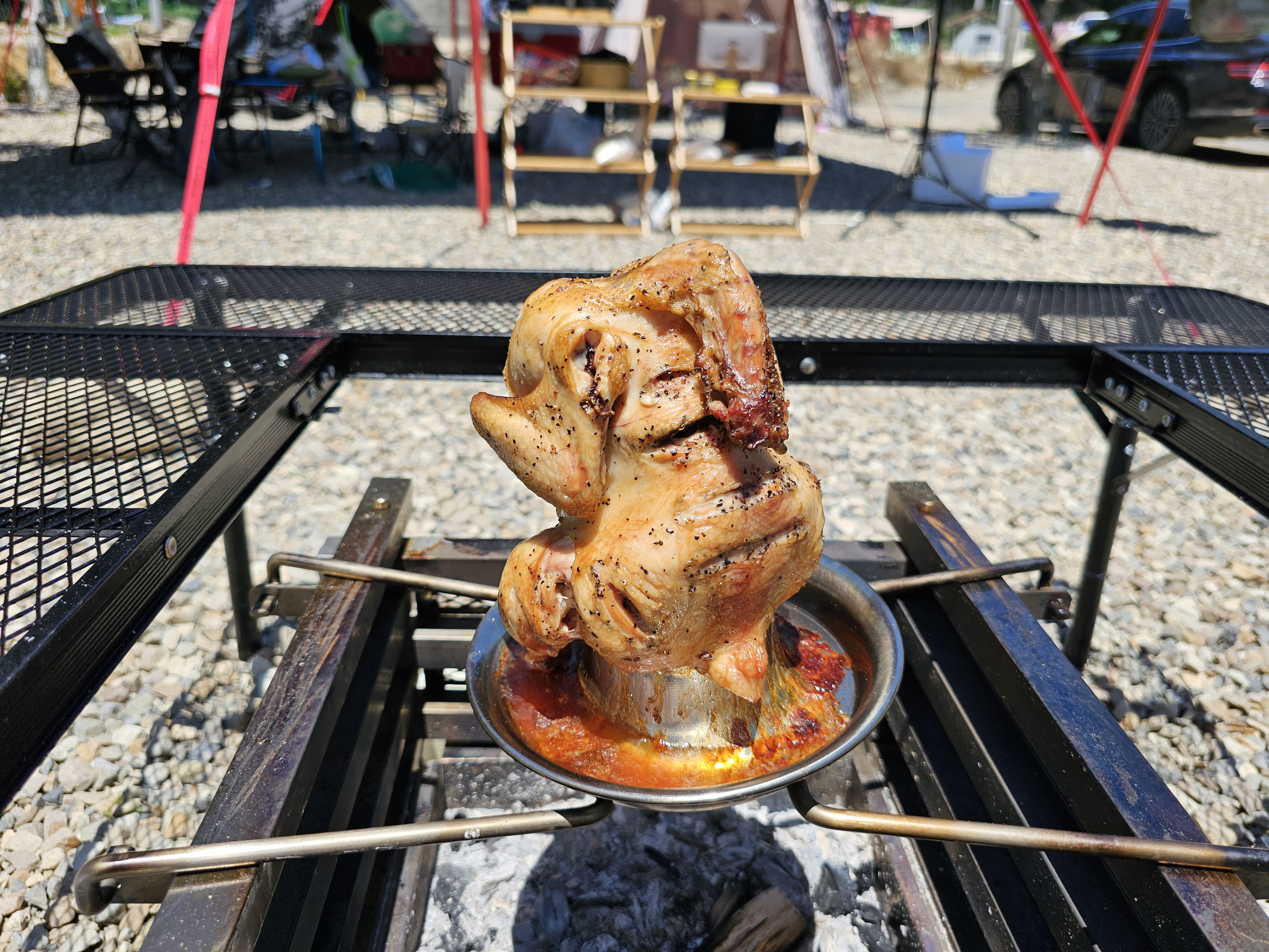 숯불을 피운 뒤 비어캔치킨을 얹고, 그 위에 덮개를 덮어주세요. 그리고 2시간 정도 구워주면 됩니다. 중간중간 화력이 약해지지 않게 숯을 보강해줬고, 잘 익었는지 확인하며 구웠어요.